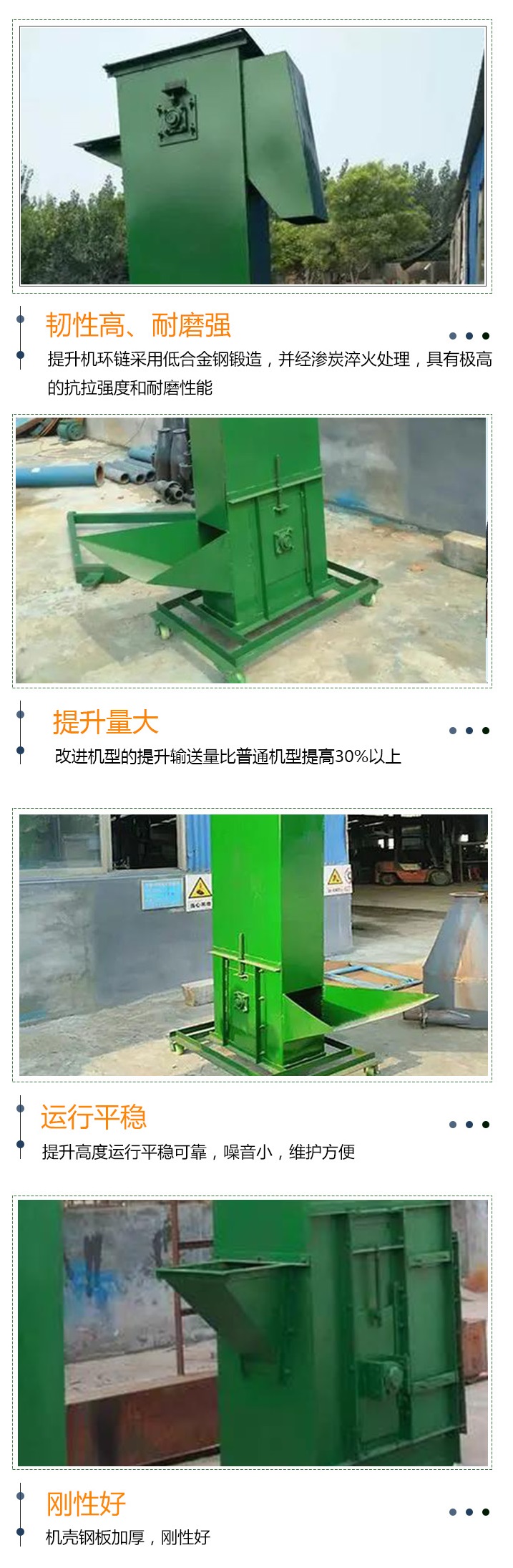 環鏈斗式提升機主要是依靠固定在鏈條上的料斗,將均勻流入尾部進料口的物料從斗式提升機尾部不間斷地提升到斗式提升機頭部,并 然后從機頭出口卸下物料,完成整個物料提升過程。適合輸送堆積密度小于1.5t/m³易于掏取的粉狀、粒狀、小塊狀的低磨琢性物料 ,如:煤、水泥、碎石、砂子、化肥等,比普通機型提高30%以上。