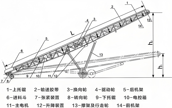 DY型移動(dòng)式皮帶輸送機(jī)的產(chǎn)品結(jié)構(gòu):