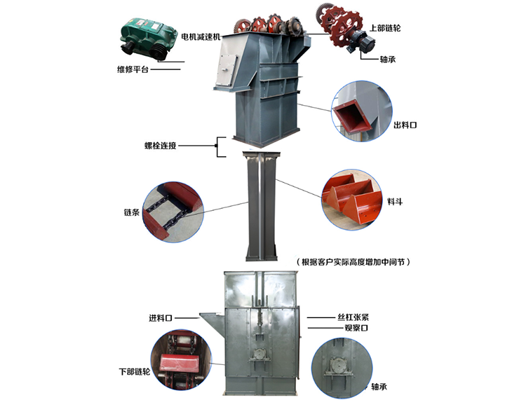 小型斗式提升機由驅動裝置、牽引構件、料斗、上下滾筒、機殼、張緊機構和進出料口這些部分組成。驅動裝置一般裝在機頭,用的是小電機加減速機,運行起來平穩。牽引件常用皮帶或者輕型鏈條,自身重量輕,磨損也小。機殼分為機頭、機座和中間節,拼接起來就能用,拆裝方便。整體寬度一般在 200 到 600 毫米,高度可以根據現場情況定做。進料口在機座側面或底部,出料口在機頭側面,能直接和料倉、振動篩、包裝機等設備連在一起。很多小型提升機還帶腳輪,移動方便,還能調節速度,適應不同物料和產量。